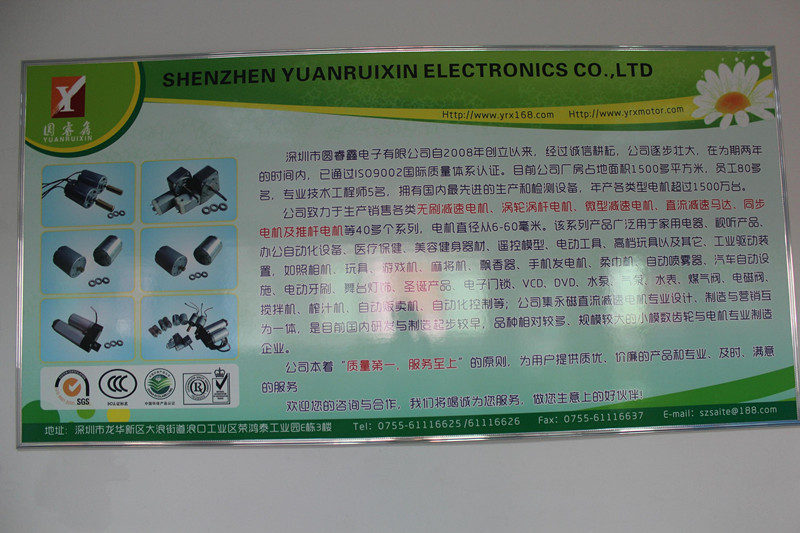 深圳市圓睿鑫電子有限公司自2008年創(chuàng)立以來,經過誠信耕耘,在為期兩年的時間內,已通過ISO9001:2000國際質量體系認證。公司廠房占地面積2000多平方米,員工100人,專業技術工程師6名,擁有國內最先進的生產和檢測設備,年產各類減速電機超過2~300萬臺。因公司發(fā)展需要,于2020年底,將生產基地遷往擁有最美小鎮之稱的東莞市清溪鎮,依山傍水,依托美麗的大自然環(huán)境和地方文化,全新的東莞市圓睿鑫電子有限公司將借助深圳母公司平臺,一步步走上新的臺階。 東莞公司將繼續(xù)致力于生產銷售各類無刷減速電機 渦輪渦桿電機,微型減速電機,直流減速馬達,交流手搖發(fā)電機、同步電機及空心杯電機等,電機直徑從6-60毫米為定位,系列產品廣泛用于智能家電、智能辦公自動化設備、智能醫療、美容健身器材、遙控模型、電動工具、高檔玩具以及其它工業驅動裝置,如高檔玩具、游戲機、麻將機、飄香器、手機發(fā)電機、柔巾機、自動噴霧器、汽車自動設施、電動牙刷、舞臺燈飾、圣誕產品、智能電子門鎖、VCD、DVD、水泵、氣泵、水表、煤氣閥、電磁閥、攪拌機、榨汁...